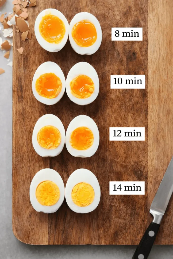 Halbierte Eier im Airfryer auf Holzbrett mit unterschiedlichen Garstufen von weich bis hart und Zeitangaben. pinit