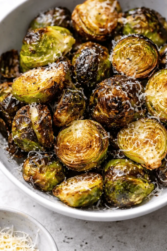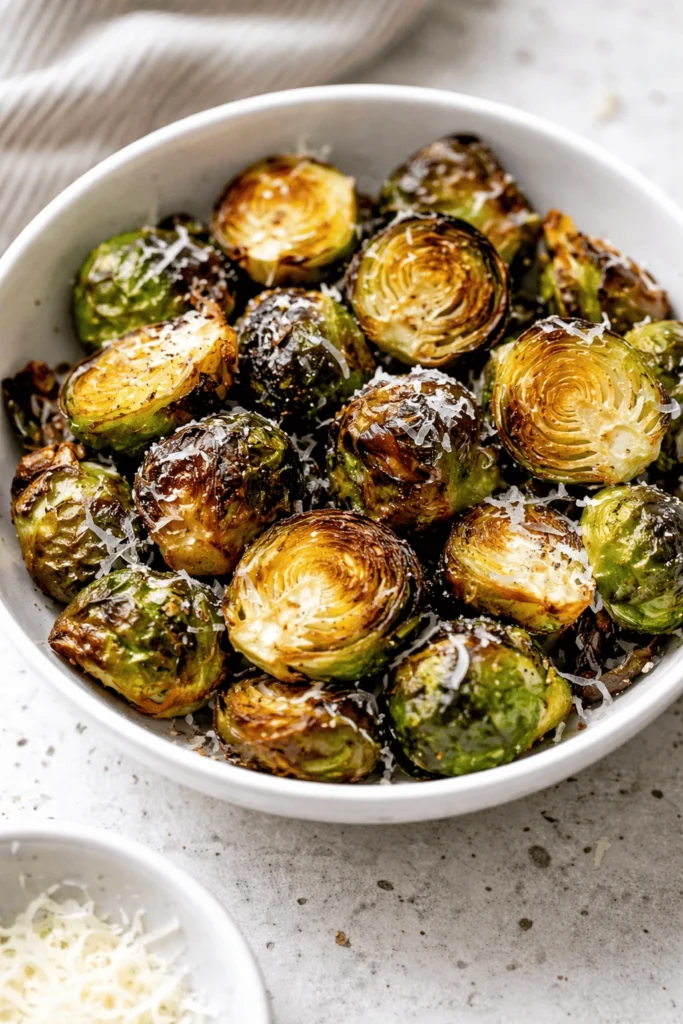 Knusprig gerösteter Air Fryer Rosenkohl aus der Heißluftfritteuse in einer weißen Schüssel, mit geriebenem Parmesan bestreut.
