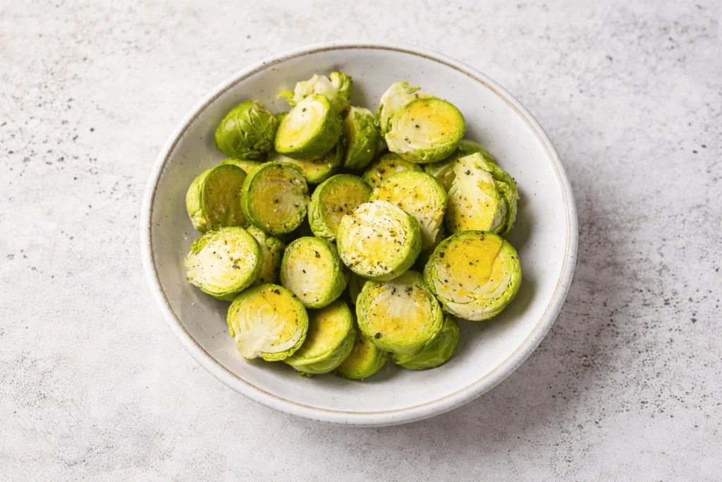 6. Rosenkohl in eine Schüssel geben und mit Olivenöl, Salz und Pfeffer vermengen, bis alles gleichmäßig bedeckt ist.