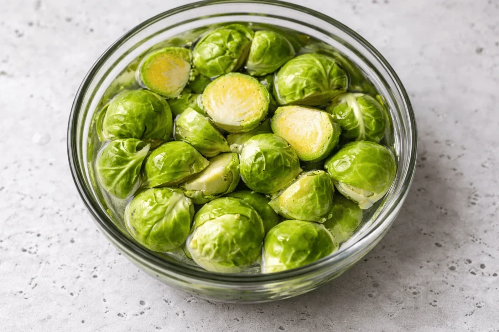 Rosenkohl vor dem Garen 10 Minuten in Wasser einweichen.