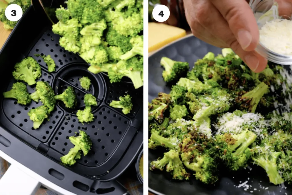 Brokkoliröschen gleichmäßig im AirFryer Korb verteilen. Achte darauf, dass der Korb nicht überfüllt wird – der Brokkoli sollte in einer einzigen Schicht liegen. Auf 200°C (400°F) für 6 Minuten einstellen. Den Korb sofort nach dem Garen herausnehmen.