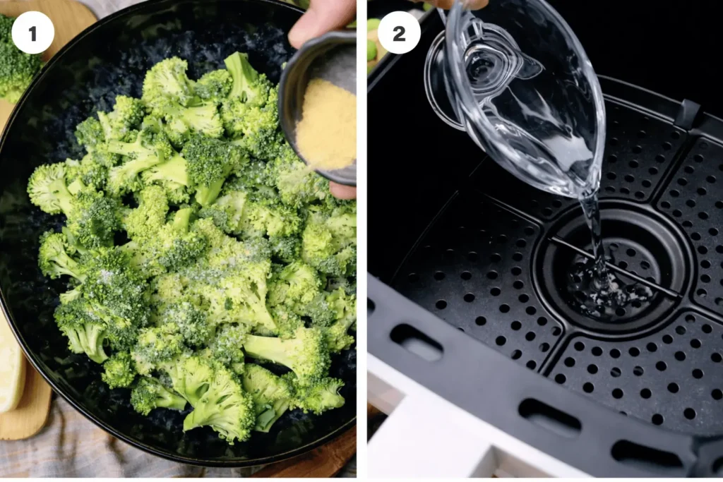 Das Wasser verhindert, dass der Brokkoli verbrennt und hilft dabei, ihn zart zu halten, während er im Airfryer gart.