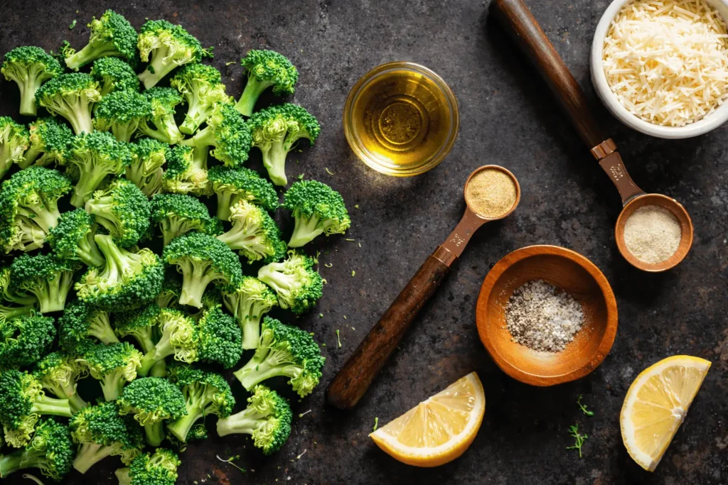 Zutaten für AirFryer Brokkoli: Olivenöl, Knoblauchpulver, Zwiebelpulver, Salz und Brokkoli.