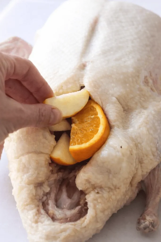 - Die Ente mit den geviertelten Orangenscheiben, Apfelstücken und ganzen Knoblauchzehen füllen.
