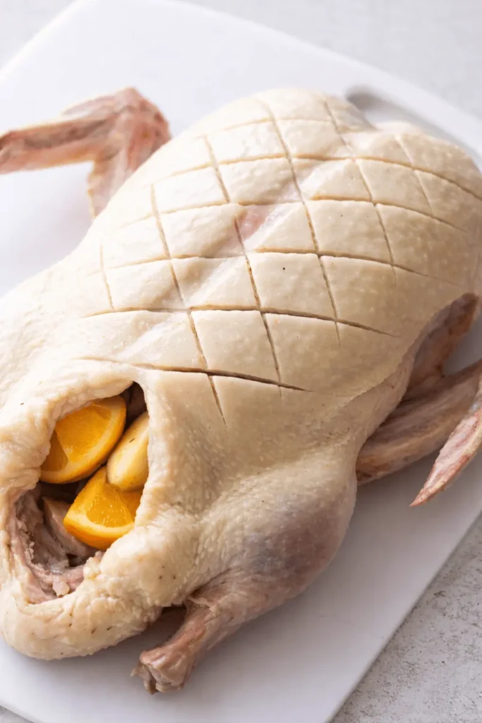- Falls die Ente gefroren ist, 2–3 Tage im Kühlschrank unbedeckt auftauen, damit die Haut trocknet.