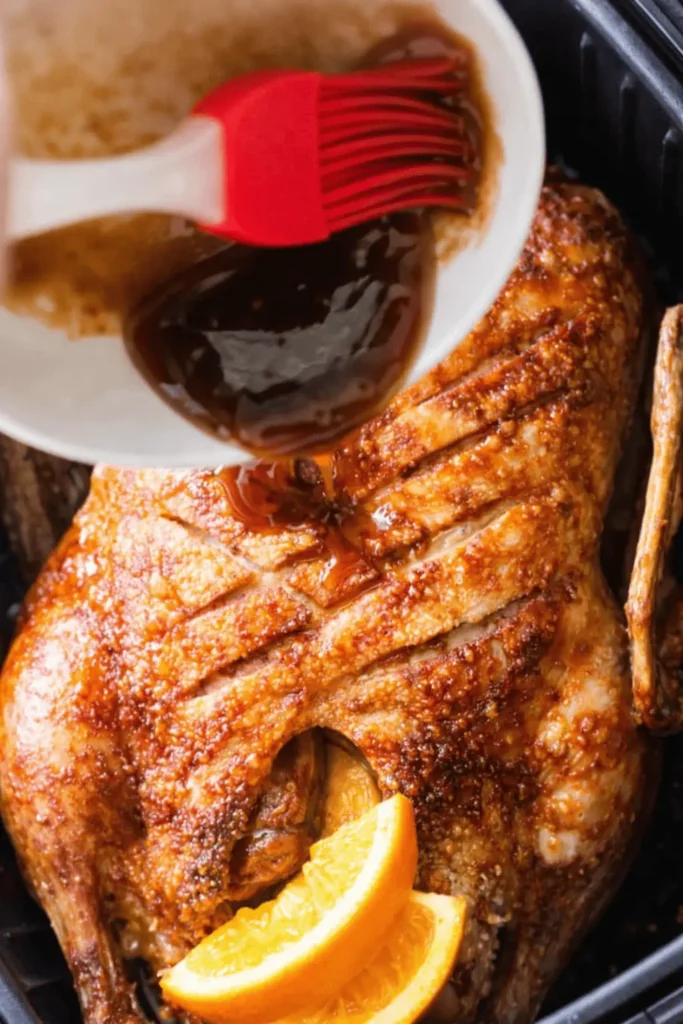 Diese Airfryer-Ente ist außen knusprig und innen unglaublich zart. Eine ganze Ente wird mit Apfel- und Orangenscheiben gefüllt, mit einer süß-würzigen Honig-Hoisin-Glasur bestrichen und in der Heißluftfritteuse perfekt gegart. Ideal für festliche Mahlzeiten oder ein besonderes Abendessen.