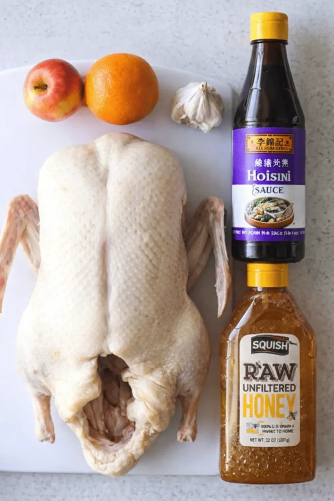 - Honig: Mit Hoisin-Sauce gemischt und gegen Ende des Garvorgangs auf die Ente gestrichen, für goldbraune Haut und süßlichen Geschmack.
