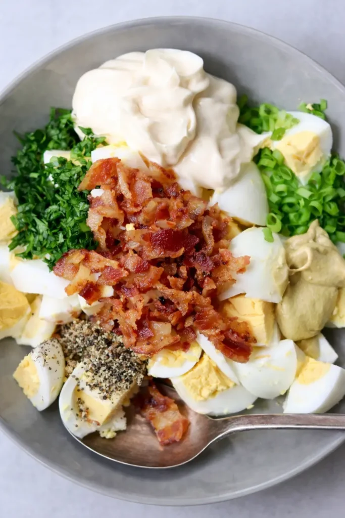 - In einer Schüssel die gehackten Eier, Speck, Mayonnaise, Dijon-Senf, Frühlingszwiebeln und Petersilie vermengen. Mit Salz und Pfeffer abschmecken und gut umrühren, bis alles cremig verbunden ist.
